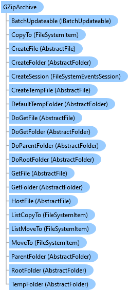 ![]() | GZipArchive Constructor | Overloaded. Specialization of the GZippedFolder class that represents the root folder in a gzip file, i.e., the gzip file itself. Since a gzip file cannot contain subfolders, this is the only type of folder you can get out of a gzip archive. |