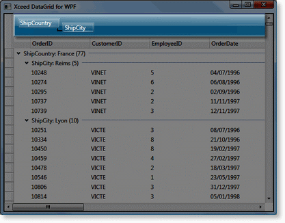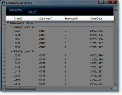 <Grid xmlns:xcdg="http://schemas.xceed.com/wpf/xaml/datagrid"> <Grid.Resources> <xcdg:DataGridCollectionViewSource x:Key="cvs_orders" Source="{Binding Source={x:Static Application.Current}, Path=Orders}"> <xcdg:DataGridCollectionViewSource.GroupDescriptions> <xcdg:DataGridGroupDescription PropertyName="ShipCountry"/> <xcdg:DataGridGroupDescription PropertyName="ShipCity"/> </xcdg:DataGridCollectionViewSource.GroupDescriptions> </xcdg:DataGridCollectionViewSource> </Grid.Resources> <xcdg:DataGridControl x:Name="OrdersGrid" ItemsSource="{Binding Source={StaticResource cvs_orders}}"> </xcdg:DataGridControl> </Grid> | |