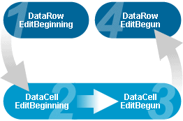 The sequence in which the edit events are raised can be seen as using an "in and out" pattern. For example, the EditBeginning event will be raised by a row and then by the cell that is about to be edited. After the row and cell have entered edit mode, the cell will raise the EditBegun event followed by the row. The following diagram attempts to illustrate this behavior: