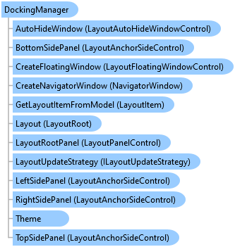 The DockingManager class is the core control of AvalonDock. Its Layout property contains the layout composition that is represented by the classes in the Xceed.Wpf.AvalonDock.Layout namespace. The class arranges the panes it contains and also handles auto-hide panes and floating windows (panes in turn contain, directly or indirectly, the two types of "content" elements, namely, LayoutAnchorable and LayoutDocument elements). The DockingManager class also handles saving and restoring layouts.